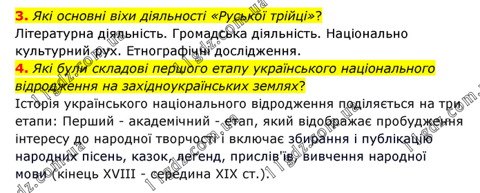 3. Які основні віхи діяльності «Руської трійці»? Літературна діяльність. Громадська діяльність. Національно культурний рух. Етнографічні дослідження. 4. Які були складові першого етапу українського національного відродження на західноукраїнських землях? Історія українського національного відродження поділяється на три етапи: Перший - академічний - етап, який відображає пробудження інтересу до народної творчості і включає збирання і публікацію народних пісень, казок, легенд, прислів'їв, вивчення народної мови (кінець XVIII - середина XIX ст.).