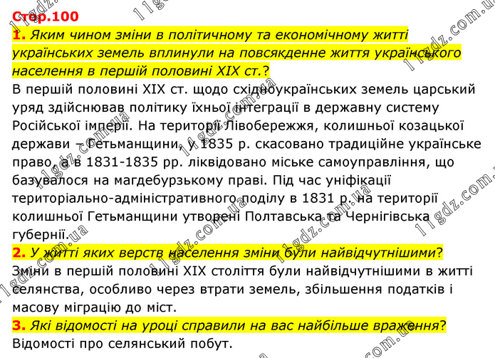 1. Яким чином зміни в політичному та економічному житті українських земель вплинули на повсякденне життя українського населення в першій половині ХІХ ст.? В першій половині XIX ст. щодо східноукраїнських земель царський уряд здійснював політику їхньої інтеграції в державну систему Російської імперії. На території Лівобережжя, колишньої козацької держави – Гетьманщини, у 1835 р. скасовано традиційне українське право, а в 1831-1835 рр. ліквідовано міське самоуправління, що базувалося на магдебурзькому праві. Під час уніфікації територіально-адміністративного поділу в 1831 р. на території колишньої Гетьманщини утворені Полтавська та Чернігівська губернії. 2. У житті яких верств населення зміни були найвідчутнішими? Зміни в першій половині XIX століття були найвідчутнішими в житті селянства, особливо через втрати земель, збільшення податків і масову міграцію до міст. 3. Які відомості на уроці справили на вас найбільше враження? Відомості про селянський побут.