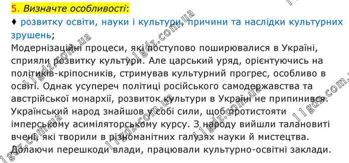 Визначте особливості: ♦ розвитку освіти, науки і культури, причини та наслідки культурних зрушень; Модернізаційні процеси, які поступово поширювалися в Україні, сприяли розвитку культури. Але царський уряд, орієнтуючись на політиків-кріпосників, стримував культурний прогрес, особливо в освіті. Однак усупереч політиці російського самодержавства та австрійської монархії, розвиток культури в Україні не припинився. Український народ знайшов у собі сили, щоб протистояти імперському асиміляторському курсу. З народу вийшли талановиті вчені, які творили в різноманітних галузях науки й мистецтва. Долаючи перешкоди влади, працювали культурно-освітні заклади.