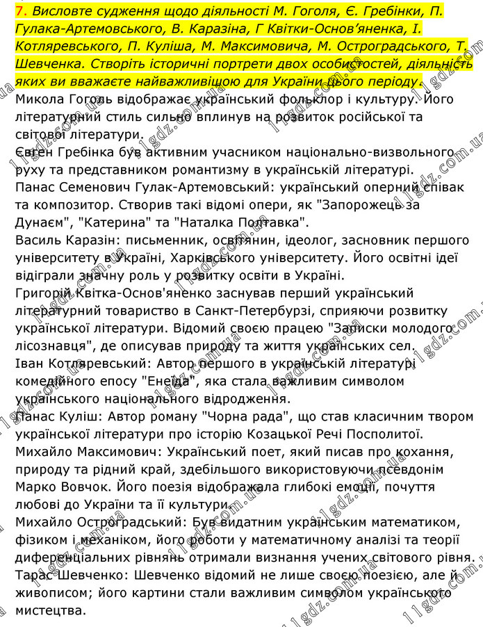 Висловте судження щодо діяльності М. Гоголя, Є. Гребінки, П. Гулака-Артемовського, В. Каразіна, Г Квітки-Основ’яненка, І. Котляревського, П. Куліша, М. Максимовича, М. Остроградського, Т. Шевченка. Створіть історичні портрети двох особистостей, діяльність яких ви вважаєте найважливішою для України цього періоду. Микола Гоголь відображає український фольклор і культуру. Його літературний стиль сильно вплинув на розвиток російської та світової літератури. Євген Гребінка був активним учасником національно-визвольного руху та представником романтизму в українській літературі. Панас Семенович Гулак-Артемовський: український оперний співак та композитор. Створив такі відомі опери, як "Запорожець за Дунаєм", "Катерина" та "Наталка Полтавка". Василь Каразін: письменник, освітянин, ідеолог, засновник першого університету в Україні, Харківського університету. Його освітні ідеї відіграли значну роль у розвитку освіти в Україні. Григорій Квітка-Основ'яненко заснував перший український літературний товариство в Санкт-Петербурзі, сприяючи розвитку української літератури. Відомий своєю працею "Записки молодого лісознавця", де описував природу та життя українських сел. Іван Котляревський: Автор першого в українській літературі комедійного епосу "Енеїда", яка стала важливим символом українського національного відродження. Панас Куліш: Автор роману "Чорна рада", що став класичним твором української літератури про історію Козацької Речі Посполитої. Михайло Максимович: Український поет, який писав про кохання, природу та рідний край, здебільшого використовуючи псевдонім Марко Вовчок. Його поезія відображала глибокі емоції, почуття любові до України та її культури. Михайло Остроградський: Був видатним українським математиком, фізиком і механіком, його роботи у математичному аналізі та теорії диференціальних рівнянь отримали визнання учених світового рівня. Тарас Шевченко: Шевченко відомий не лише своєю поезією, але й живописом; його картини стали важливим символом українського мистецтва.