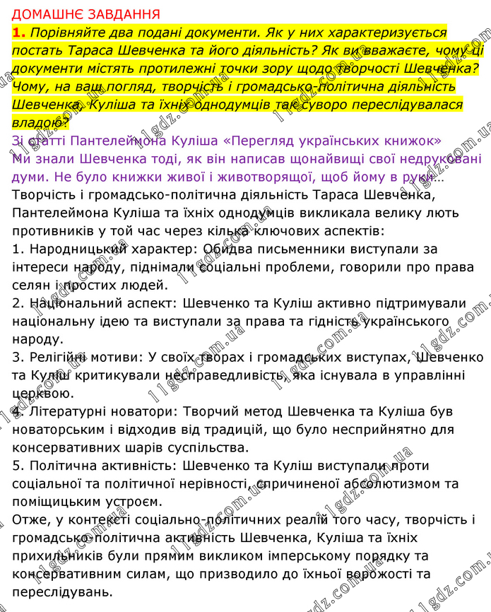 ДОМАШНЄ ЗАВДАННЯ 1. Порівняйте два подані документи. Як у них характеризується постать Тараса Шевченка та його діяльність? Як ви вважаєте, чому ці документи містять протилежні точки зору щодо творчості Шевченка? Чому, на ваш погляд, творчість і громадсько-політична діяльність Шевченка, Куліша та їхніх однодумців так суворо переслідувалася владою? Зі статті Пантелеймона Куліша «Перегляд українських книжок» Ми знали Шевченка тоді, як він написав щонайвищі свої недруковані думи. Не було книжки живої і животворящої, щоб йому в руки… Творчість і громадсько-політична діяльність Тараса Шевченка, Пантелеймона Куліша та їхніх однодумців викликала велику лють противників у той час через кілька ключових аспектів: 1. Народницький характер: Обидва письменники виступали за інтереси народу, піднімали соціальні проблеми, говорили про права селян і простих людей. 2. Національний аспект: Шевченко та Куліш активно підтримували національну ідею та виступали за права та гідність українського народу. 3. Релігійні мотиви: У своїх творах і громадських виступах, Шевченко та Куліш критикували несправедливість, яка існувала в управлінні церквою. 4. Літературні новатори: Творчий метод Шевченка та Куліша був новаторським і відходив від традицій, що було несприйнятно для консервативних шарів суспільства. 5. Політична активність: Шевченко та Куліш виступали проти соціальної та політичної нерівності, спричиненої абсолютизмом та поміщицьким устроєм. Отже, у контексті соціально-політичних реалій того часу, творчість і громадсько-політична активність Шевченка, Куліша та їхніх прихильників були прямим викликом імперському порядку та консервативним силам, що призводило до їхньої ворожості та переслідувань.