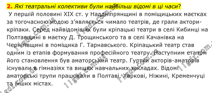 Які театральні колективи були найбільш відомі в ці часи? У першій половині XIX ст. у Наддніпрянщині в поміщицьких маєтках за тогочасною модою з’являється чимало театрів, де грали актори-кріпаки. Серед найвідоміших були кріпацькі театри в селі Кибинці на Полтавщині в маєтку Д. Трощинського та в селі Качанівка на Чернігівщині в поміщика Г. Тарнавського. Кріпацький театр став одним із етапів формування професійного театру. Наступним етапом його становлення був аматорський театр. Гуртки акторів-аматорів існували в гімназіях та вищих навчальних закладах. Відомі аматорські трупи працювали в Полтаві, Харкові, Ніжині, Кременчуці та інших містах.