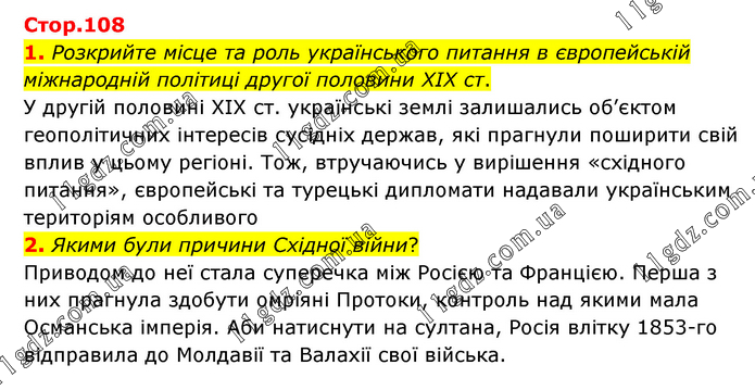 1. Розкрийте місце та роль українського питання в європейській міжнародній політиці другої половини ХІХ ст. У другій половині XIX ст. українські землі залишались об’єктом геополітичних інтересів сусідніх держав, які прагнули поширити свій вплив у цьому регіоні. Тож, втручаючись у вирішення «східного питання», європейські та турецькі дипломати надавали українським територіям особливого 2. Якими були причини Східної війни? Приводом до неї стала суперечка між Росією та Францією. Перша з них прагнула здобути омріяні Протоки, контроль над якими мала Османська імперія. Аби натиснути на султана, Росія влітку 1853-го відправила до Молдавії та Валахії свої війська.