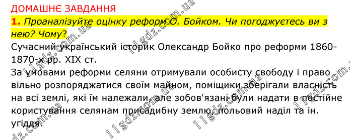 ДОМАШНЄ ЗАВДАННЯ 1. Проаналізуйте оцінку реформ О. Бойком. Чи погоджуєтесь ви з нею? Чому? Сучасний український історик Олександр Бойко про реформи 1860-1870-х рр. XIX ст. За умовами реформи селяни отримували особисту свободу і право вільно розпоряджатися своїм майном, поміщики зберігали власність на всі землі, які їм належали, але зобов'язані були надати в постійне користування селянам присадибну землю, польовий наділ та ін. угіддя.