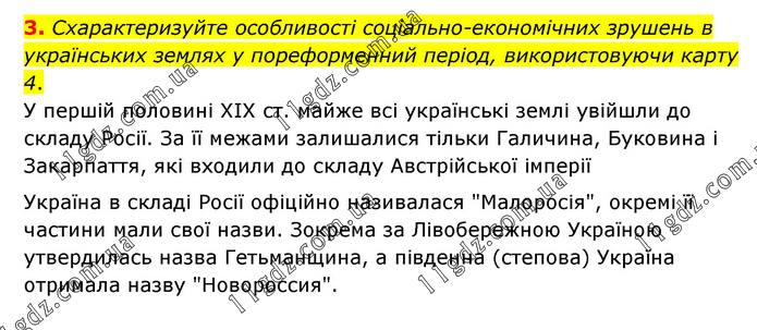 Схарактеризуйте особливості соціально-економічних зрушень в українських землях у пореформенний період, використовуючи карту 4. У першій половині XIX ст. майже всі українські землі увійшли до складу Росії. За її межами залишалися тільки Галичина, Буковина і Закарпаття, які входили до складу Австрійської імперії Україна в складі Росії офіційно називалася "Малоросія", окремі її частини мали свої назви. Зокрема за Лівобережною Україною утвердилась назва Гетьманщина, а південна (степова) Україна отримала назву "Новороссия".