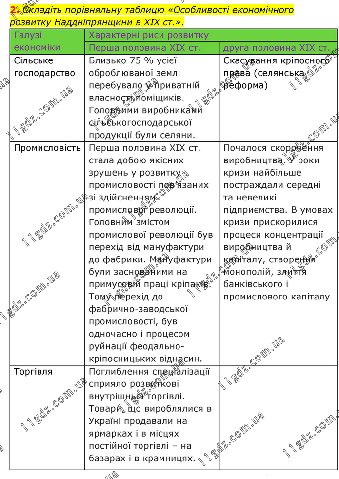 Складіть порівняльну таблицю «Особливості економічного розвитку Наддніпрянщини в ХІХ ст.». Галузі економіки Характерні риси розвитку Перша половина ХІХ ст. друга половина ХІХ ст. Сільське господарство Близько 75 % усієї оброблюваної землі перебувало у приватній власності поміщиків. Головними виробниками сільськогосподарської продукції були селяни. Скасування кріпосного права (селянська реформа) Промисловість Перша половина ХІХ ст. стала добою якісних зрушень у розвитку промисловості пов’язаних зі здійсненням промислової революції. Головним змістом промислової революції був перехід від мануфактури до фабрики. Мануфактури були заснованими на примусовій праці кріпаків. Тому перехід до фабрично-заводської промисловості, був одночасно і процесом руйнації феодально-кріпосницьких відносин. Почалося скорочення виробництва. У роки кризи найбільше постраждали середні та невеликі підприємства. В умовах кризи прискорилися процеси концентрації виробництва й капіталу, створення монополій, злиття банківського і промислового капіталу Торгівля Поглиблення спеціалізації сприяло розвиткові внутрішньої торгівлі. Товари, що вироблялися в Україні продавали на ярмарках і в місцях постійної торгівлі – на базарах і в крамницях.