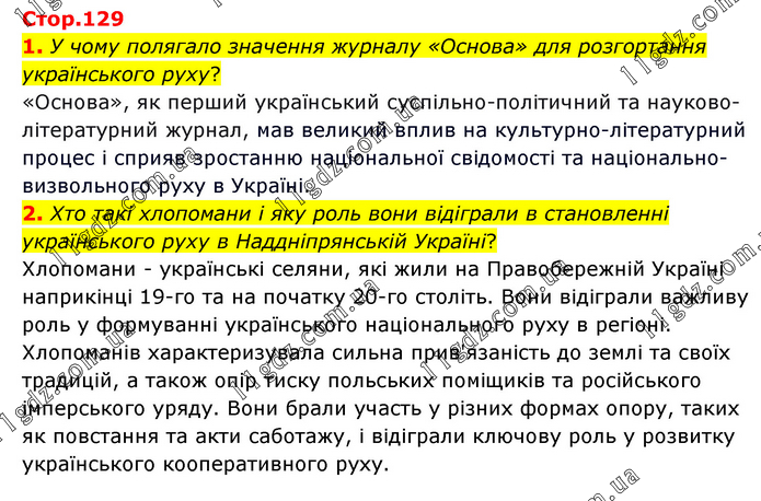 1. У чому полягало значення журналу «Основа» для розгортання українського руху? «Основа», як перший український суспільно-політичний та науково-літературний журнал, мав великий вплив на культурно-літературний процес і сприяв зростанню національної свідомості та національно-визвольного руху в Україні. 2. Хто такі хлопомани і яку роль вони відіграли в становленні українського руху в Наддніпрянській Україні? Хлопомани - українські селяни, які жили на Правобережній Україні наприкінці 19-го та на початку 20-го століть. Вони відіграли важливу роль у формуванні українського національного руху в регіоні. Хлопоманів характеризувала сильна прив'язаність до землі та своїх традицій, а також опір тиску польських поміщиків та російського імперського уряду. Вони брали участь у різних формах опору, таких як повстання та акти саботажу, і відіграли ключову роль у розвитку українського кооперативного руху.