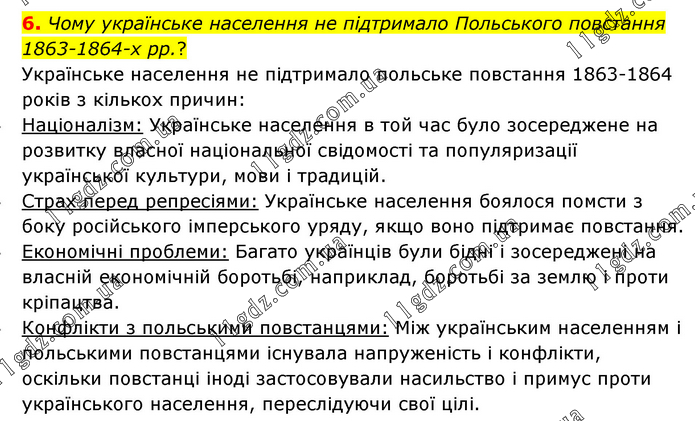 Чому українське населення не підтримало Польського повстання 1863-1864-х рр.? Українське населення не підтримало польське повстання 1863-1864 років з кількох причин: • Націоналізм: Українське населення в той час було зосереджене на розвитку власної національної свідомості та популяризації української культури, мови і традицій. • Страх перед репресіями: Українське населення боялося помсти з боку російського імперського уряду, якщо воно підтримає повстання. • Економічні проблеми: Багато українців були бідні і зосереджені на власній економічній боротьбі, наприклад, боротьбі за землю і проти кріпацтва. • Конфлікти з польськими повстанцями: Між українським населенням і польськими повстанцями існувала напруженість і конфлікти, оскільки повстанці іноді застосовували насильство і примус проти українського населення, переслідуючи свої цілі.