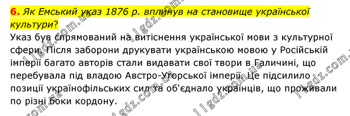 Як Емський указ 1876 р. вплинув на становище української культури? Указ був спрямований на витіснення української мови з культурної сфери. Після заборони друкувати українською мовою у Російській імперії багато авторів стали видавати свої твори в Галичині, що перебувала під владою Австро-Угорської імперії. Це підсилило позиції українофільських сил та об'єднало українців, що проживали по різні боки кордону.
