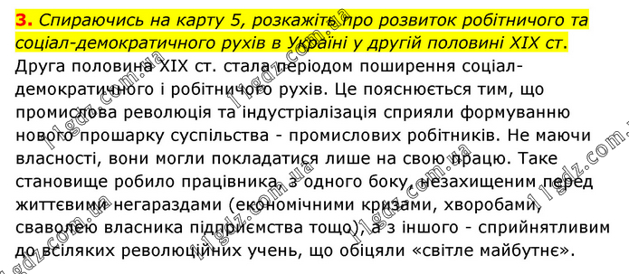 Спираючись на карту 5, розкажіть про розвиток робітничого та соціал-демократичного рухів в Україні у другій половині ХІХ ст. Друга половина XIX ст. стала періодом поширення соціал-демократичного і робітничого рухів. Це пояснюється тим, що промислова революція та індустріалізація сприяли формуванню нового прошарку суспільства - промислових робітників. He маючи власності, вони могли покладатися лише на свою працю. Таке становище робило працівника, з одного боку, незахищеним перед життєвими негараздами (економічними кризами, хворобами, сваволею власника підприємства тощо), а з іншого - сприйнятливим до всіляких революційних учень, що обіцяли «світле майбутнє».