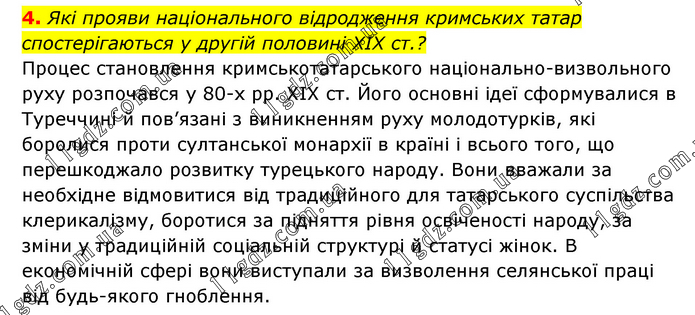 Які прояви національного відродження кримських татар спостерігаються у другій половині ХІХ ст.? Процес становлення кримськотатарського національно-визвольного руху розпочався у 80-х рр. XIX ст. Його основні ідеї сформувалися в Туреччині й пов’язані з виникненням руху молодотурків, які боролися проти султанської монархії в країні і всього того, що перешкоджало розвитку турецького народу. Вони вважали за необхідне відмовитися від традиційного для татарського суспільства клерикалізму, боротися за підняття рівня освіченості народу, за зміни у традиційній соціальній структурі й статусі жінок. В економічній сфері вони виступали за визволення селянської праці від будь-якого гноблення.