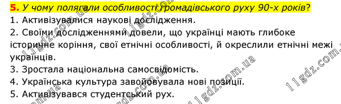 У чому полягали особливості громадівського руху 90-х років? 1. Активізувалися наукові дослідження. 2. Своїми дослідженнями довели, що українці мають глибоке історичне коріння, свої етнічні особливості, й окреслили етнічні межі українців. 3. Зростала національна самосвідомість. 4. Українська культура завойовувала нові позиції. 5. Активізувався студентський рух.