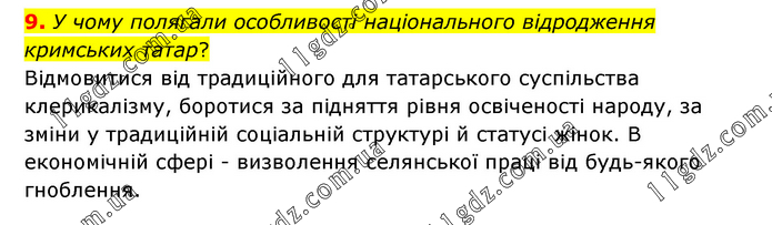 У чому полягали особливості національного відродження кримських татар? Відмовитися від традиційного для татарського суспільства клерикалізму, боротися за підняття рівня освіченості народу, за зміни у традиційній соціальній структурі й статусі жінок. В економічній сфері - визволення селянської праці від будь-якого гноблення.