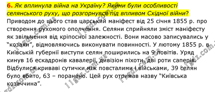 Як вплинула війна на Україну? Якими були особливості селянського руху, що розгорнувся під впливом Східної війни? Приводом до цього став царський маніфест від 25 січня 1855 р. про створення рухомого ополчення. Селяни сприйняли зміст маніфесту як звільнення від кріпосної залежності. Вони масово записувались у “козаки”, відмовляючись виконувати повинності. У лютому 1855 р. в Київській губернії виступи селян поширились на 9 повітів. Уряд кинув 16 ескадронів кавалерії, дивізіон піхоти, дві роти саперів. Відбулися криваві сутички між повсталими і військами, 39 селян було вбито, 63 – поранено. Цей рух отримав назву “Київська козаччина”.