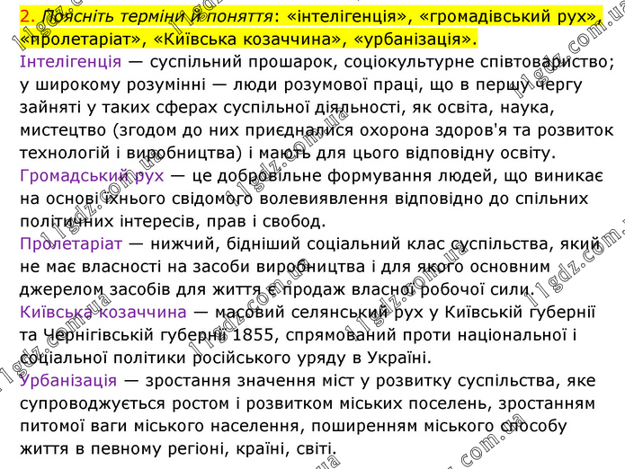 Поясніть терміни й поняття: «інтелігенція», «громадівський рух», «пролетаріат», «Київська козаччина», «урбанізація». Інтелігенція — суспільний прошарок, соціокультурне співтовариство; у широкому розумінні — люди розумової праці, що в першу чергу зайняті у таких сферах суспільної діяльності, як освіта, наука, мистецтво (згодом до них приєдналися охорона здоров'я та розвиток технологій і виробництва) і мають для цього відповідну освіту. Громадський рух — це добровільне формування людей, що виникає на основі їхнього свідомого волевиявлення відповідно до спільних політичних інтересів, прав і свобод. Пролетаріат — нижчий, бідніший соціальний клас суспільства, який не має власності на засоби виробництва і для якого основним джерелом засобів для життя є продаж власної робочої сили. Київська козаччина — масовий селянський рух у Київській губернії та Чернігівській губернії 1855, спрямований проти національної і соціальної політики російського уряду в Україні. Урбанізація — зростання значення міст у розвитку суспільства, яке супроводжується ростом і розвитком міських поселень, зростанням питомої ваги міського населення, поширенням міського способу життя в певному регіоні, країні, світі.