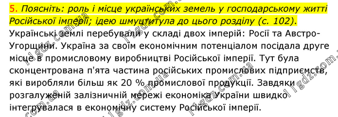 Поясніть: роль і місце українських земель у господарському житті Російської імперії; ідею шмуцтитула до цього розділу (с. 102). Українські землі перебували у складі двох імперій: Росії та Австро-Угорщини. Україна за своїм економічним потенціалом посідала друге місце в промисловому виробництві Російської імперії. Тут була сконцентрована п'ята частина російських промислових підприємств, які виробляли більш як 20 % промислової продукції. Завдяки розгалуженій залізничній мережі економіка України швидко інтегрувалася в економічну систему Російської імперії.