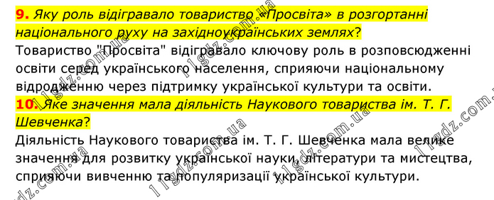 9. Яку роль відігравало товариство «Просвіта» в розгортанні національного руху на західноукраїнських землях? Товариство "Просвіта" відігравало ключову роль в розповсюдженні освіти серед українського населення, сприяючи національному відродженню через підтримку української культури та освіти. 10. Яке значення мала діяльність Наукового товариства ім. Т. Г. Шевченка? Діяльність Наукового товариства ім. Т. Г. Шевченка мала велике значення для розвитку української науки, літератури та мистецтва, сприяючи вивченню та популяризації української культури.