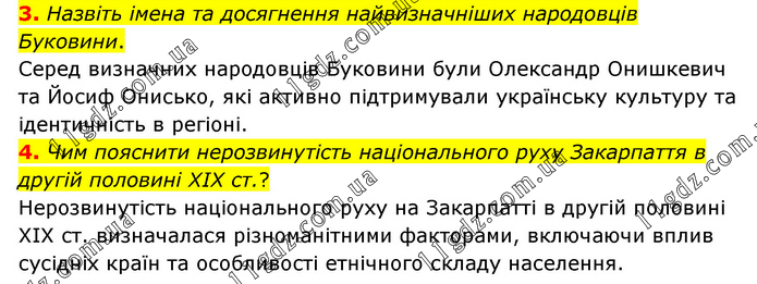 3. Назвіть імена та досягнення найвизначніших народовців Буковини. Серед визначних народовців Буковини були Олександр Онишкевич та Йосиф Онисько, які активно підтримували українську культуру та ідентичність в регіоні. 4. Чим пояснити нерозвинутість національного руху Закарпаття в другій половині XIX ст.? Нерозвинутість національного руху на Закарпатті в другій половині XIX ст. визначалася різноманітними факторами, включаючи вплив сусідніх країн та особливості етнічного складу населення.