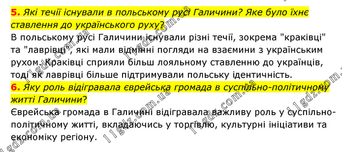 5. Які течії існували в польському русі Галичини? Яке було їхнє ставлення до українського руху? В польському русі Галичини існували різні течії, зокрема "краківці" та "лаврівці", які мали відмінні погляди на взаємини з українським рухом. Краківці сприяли більш лояльному ставленню до українців, тоді як лаврівці більше підтримували польську ідентичність. 6. Яку роль відігравала єврейська громада в суспільно-політичному житті Галичини? Єврейська громада в Галичині відігравала важливу роль у суспільно-політичному житті, вкладаючись у торгівлю, культурні ініціативи та економіку регіону.