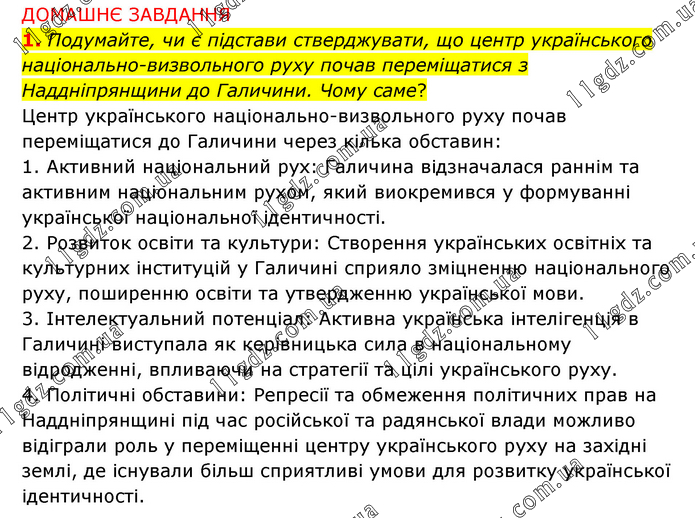 ДОМАШНЄ ЗАВДАННЯ 1. Подумайте, чи є підстави стверджувати, що центр українського національно-визвольного руху почав переміщатися з Наддніпрянщини до Галичини. Чому саме? Центр українського національно-визвольного руху почав переміщатися до Галичини через кілька обставин: 1. Активний національний рух: Галичина відзначалася раннім та активним національним рухом, який виокремився у формуванні української національної ідентичності. 2. Розвиток освіти та культури: Створення українських освітніх та культурних інституцій у Галичині сприяло зміцненню національного руху, поширенню освіти та утвердженню української мови. 3. Інтелектуальний потенціал: Активна українська інтелігенція в Галичині виступала як керівницька сила в національному відродженні, впливаючи на стратегії та цілі українського руху. 4. Політичні обставини: Репресії та обмеження політичних прав на Наддніпрянщині під час російської та радянської влади можливо відіграли роль у переміщенні центру українського руху на західні землі, де існували більш сприятливі умови для розвитку української ідентичності.