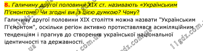 Галичину другої половини ХІХ ст. називають «Українським П’ємонтом». Чи згодні ви із цією думкою? Чому? Галичину другої половини XIX століття можна назвати "Українським П'ємонтoм", оскільки регіон активно протиставлявся асиміляційним тенденціям і прагнув до створення української національної ідентичності та державності.