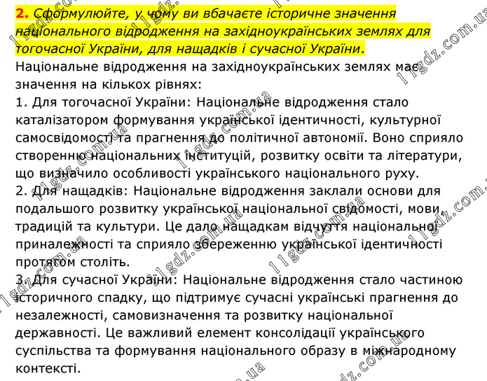 Сформулюйте, у чому ви вбачаєте історичне значення національного відродження на західноукраїнських землях для тогочасної України, для нащадків і сучасної України. Національне відродження на західноукраїнських землях має значення на кількох рівнях: 1. Для тогочасної України: Національне відродження стало каталізатором формування української ідентичності, культурної самосвідомості та прагнення до політичної автономії. Воно сприяло створенню національних інституцій, розвитку освіти та літератури, що визначило особливості українського національного руху. 2. Для нащадків: Національне відродження заклали основи для подальшого розвитку української національної свідомості, мови, традицій та культури. Це дало нащадкам відчуття національної приналежності та сприяло збереженню української ідентичності протягом століть. 3. Для сучасної України: Національне відродження стало частиною історичного спадку, що підтримує сучасні українські прагнення до незалежності, самовизначення та розвитку національної державності. Це важливий елемент консолідації українського суспільства та формування національного образу в міжнародному контексті.