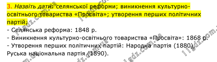 Назвіть дати: селянської реформи; виникнення культурно-освітнього товариства «Просвіта»; утворення перших політичних партій. - Селянська реформа: 1848 р. - Виникнення культурно-освітнього товариства «Просвіта»: 1868 р. - Утворення перших політичних партій: Народна партія (1880), Руська національна партія (1890).