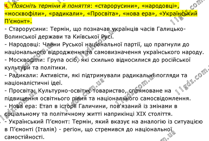 Поясніть терміни й поняття: «старорусини», «народовці», «москвофіли», «радикали», «Просвіта», «нова ера», «Український П’ємонт». - Старорусини: Термін, що позначав українців часів Галицько-Волинської держави та Київської Русі. - Народовці: Члени Руської національної партії, що прагнули до національного відродження та самовизначення українського народу. - Москвофіли: Група осіб, які схильно відносилися до російської культури та політики. - Радикали: Активісти, які підтримували радикальні погляди та націоналістичні ідеї. - Просвіта: Культурно-освітнє товариство, спрямоване на підвищення освітнього рівня та національного самосвідомлення. - Нова ера: Етап в історії Галичини, пов'язаний із змінами в соціальному та політичному житті наприкінці XIX століття. - Український П’ємонт: Термін, який вказує на аналогію із ситуацією в П’ємонті (Італія) - регіон, що стремився до національної самостійності.