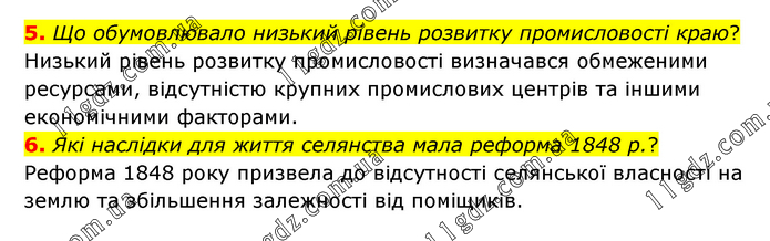 5. Що обумовлювало низький рівень розвитку промисловості краю? Низький рівень розвитку промисловості визначався обмеженими ресурсами, відсутністю крупних промислових центрів та іншими економічними факторами. 6. Які наслідки для життя селянства мала реформа 1848 р.? Реформа 1848 року призвела до відсутності селянської власності на землю та збільшення залежності від поміщиків.