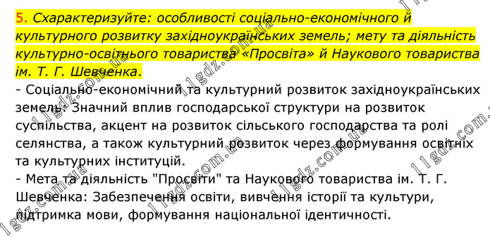 Схарактеризуйте: особливості соціально-економічного й культурного розвитку західноукраїнських земель; мету та діяльність культурно-освітнього товариства «Просвіта» й Наукового товариства ім. Т. Г. Шевченка. - Соціально-економічний та культурний розвиток західноукраїнських земель: Значний вплив господарської структури на розвиток суспільства, акцент на розвиток сільського господарства та ролі селянства, а також культурний розвиток через формування освітніх та культурних інституцій. - Мета та діяльність "Просвіти" та Наукового товариства ім. Т. Г. Шевченка: Забезпечення освіти, вивчення історії та культури, підтримка мови, формування національної ідентичності.