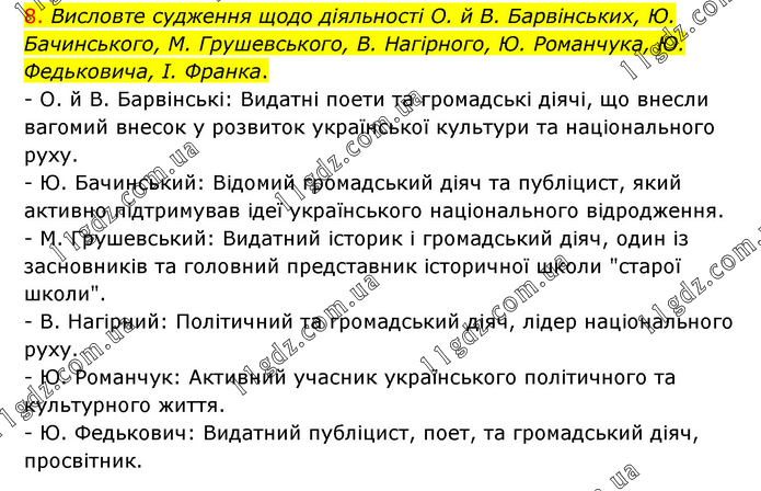 Висловте судження щодо діяльності О. й В. Барвінських, Ю. Бачинського, М. Грушевського, В. Нагірного, Ю. Романчука, Ю. Федьковича, І. Франка. - О. й В. Барвінські: Видатні поети та громадські діячі, що внесли вагомий внесок у розвиток української культури та національного руху. - Ю. Бачинський: Відомий громадський діяч та публіцист, який активно підтримував ідеї українського національного відродження. - М. Грушевський: Видатний історик і громадський діяч, один із засновників та головний представник історичної школи "старої школи". - В. Нагірний: Політичний та громадський діяч, лідер національного руху. - Ю. Романчук: Активний учасник українського політичного та культурного життя. - Ю. Федькович: Видатний публіцист, поет, та громадський діяч, просвітник.