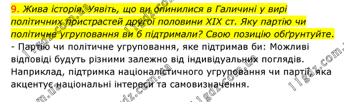 Жива історія. Уявіть, що ви опинилися в Галичині у вирі політичних пристрастей другої половини XIX ст. Яку партію чи політичне угруповання ви б підтримали? Свою позицію обґрунтуйте. - Партію чи політичне угруповання, яке підтримав би: Можливі відповіді будуть різними залежно від індивідуальних поглядів. Наприклад, підтримка націоналістичного угруповання чи партії, яка акцентує національні інтереси та самовизначення.