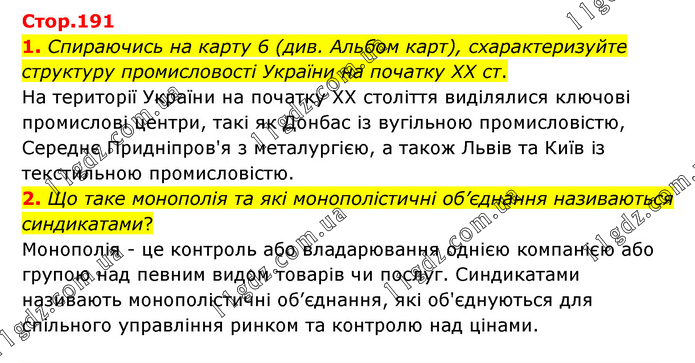 1. Спираючись на карту 6 (див. Альбом карт), схарактеризуйте структуру промисловості України на початку ХХ ст. На території України на початку ХХ століття виділялися ключові промислові центри, такі як Донбас із вугільною промисловістю, Середнє Придніпров'я з металургією, а також Львів та Київ із текстильною промисловістю. 2. Що таке монополія та які монополістичні об’єднання називаються синдикатами? Монополія - це контроль або владарювання однією компанією або групою над певним видом товарів чи послуг. Синдикатами називають монополістичні об’єднання, які об'єднуються для спільного управління ринком та контролю над цінами.