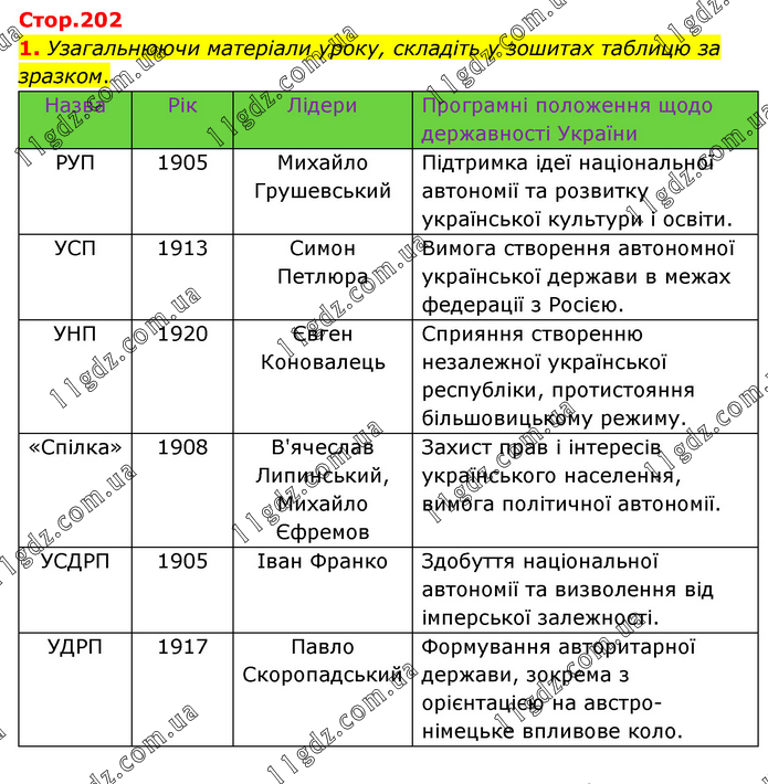 Узагальнюючи матеріали уроку, складіть у зошитах таблицю за зразком. Назва Рік Лідери Програмні положення щодо державності України РУП 1905 Михайло Грушевський Підтримка ідеї національної автономії та розвитку української культури і освіти. УСП 1913 Симон Петлюра Вимога створення автономної української держави в межах федерації з Росією. УНП 1920 Євген Коновалець Сприяння створенню незалежної української республіки, протистояння більшовицькому режиму. «Спілка» 1908 В'ячеслав Липинський, Михайло Єфремов Захист прав і інтересів українського населення, вимога політичної автономії. УСДРП 1905 Іван Франко Здобуття національної автономії та визволення від імперської залежності. УДРП 1917 Павло Скоропадський Формування авторитарної держави, зокрема з орієнтацією на австро-німецьке впливове коло.