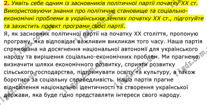Уявіть себе одним із засновників політичної партії початку ХХ ст. Використовуючи знання про політичне становище та соціально-економічні проблеми в українських землях початку ХХ ст., підготуйте та захистить проект програми своєї партії. Я, як засновник політичної партії на початку ХХ століття, пропоную програму, яка відповідає важливим викликам того часу. Наша партія спрямована на досягнення національної автономії для українського народу та вирішення соціально-економічних проблем. Ми прагнемо визначити шляхи економічного розвитку, сприяти розвитку сільського господарства, підтримувати освіту та культуру, а також боротися за соціальну справедливість. Наша партія прагне відновлення національної ідентичності та створення української держави, яка буде гідно представляти інтереси свого народу.