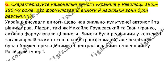 Схарактеризуйте національні вимоги українців у Революції 1905-1907-х років. Хто формулював ці вимоги й наскільки вони були реальними? Українці висували вимоги щодо національно-культурної автономії та рівних прав. Лідери, такі як Михайло Грушевський та Іван Франко, активно формулювали ці вимоги. Вимоги були реальними у контексті загальноросійських та соціальних трансформацій, але реалізація була обмежена реакційними та централізованими тенденціями у Російській імперії.