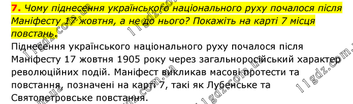 Чому піднесення українського національного руху почалося після Маніфесту 17 жовтня, а не до нього? Покажіть на карті 7 місця повстань. Піднесення українського національного руху почалося після Маніфесту 17 жовтня 1905 року через загальноросійський характер революційних подій. Маніфест викликав масові протести та повстання, позначені на карті 7, такі як Лубенське та Святопетровське повстання.