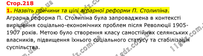1. Назвіть причини та цілі аграрної реформи П. Столипіна. Аграрна реформа П. Столипіна була запроваджена в контексті вирішення соціально-економічних проблем після Революції 1905-1907 років. Метою було створення класу самостійних селянських власників, підвищення їхнього соціального статусу та стабілізація суспільства.