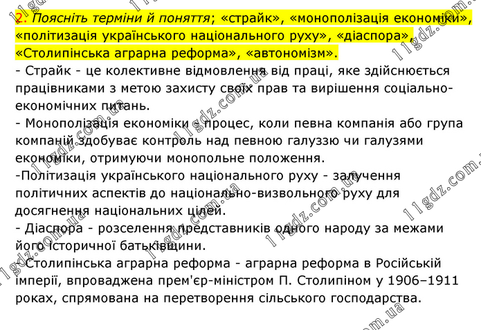 Поясніть терміни й поняття; «страйк», «монополізація економіки», «політизація українського національного руху», «діаспора», «Столипінська аграрна реформа», «автономізм». - Страйк - це колективне відмовлення від праці, яке здійснюється працівниками з метою захисту своїх прав та вирішення соціально-економічних питань. - Монополізація економіки - процес, коли певна компанія або група компаній здобуває контроль над певною галуззю чи галузями економіки, отримуючи монопольне положення. -Політизація українського національного руху - залучення політичних аспектів до національно-визвольного руху для досягнення національних цілей. - Діаспора - розселення представників одного народу за межами його історичної батьківщини. - Столипінська аграрна реформа - аграрна реформа в Російській імперії, впроваджена прем'єр-міністром П. Столипіном у 1906–1911 роках, спрямована на перетворення сільського господарства.
