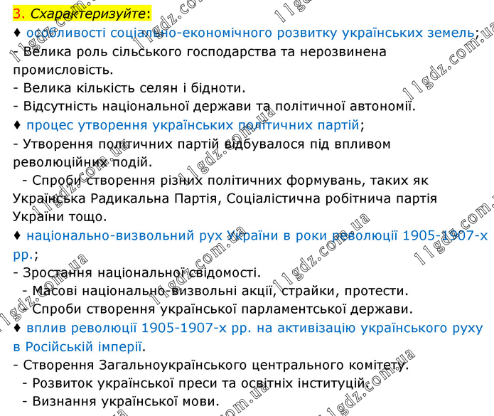 Схарактеризуйте: ♦ особливості соціально-економічного розвитку українських земель; - Велика роль сільського господарства та нерозвинена промисловість. - Велика кількість селян і бідноти. - Відсутність національної держави та політичної автономії. ♦ процес утворення українських політичних партій; - Утворення політичних партій відбувалося під впливом революційних подій. - Спроби створення різних політичних формувань, таких як Українська Радикальна Партія, Соціалістична робітнича партія України тощо. ♦ національно-визвольний рух України в роки революції 1905-1907-х рр.; - Зростання національної свідомості. - Масові національно-визвольні акції, страйки, протести. - Спроби створення української парламентської держави. ♦ вплив революції 1905-1907-х рр. на активізацію українського руху в Російській імперії. - Створення Загальноукраїнського центрального комітету. - Розвиток української преси та освітніх інституцій. - Визнання української мови.