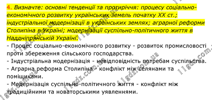 Визначте: основні тенденції та протиріччя: процесу соціально-економічного розвитку українських земель початку ХХ ст.; індустріальної модернізації в українських землях; аграрної реформи Столипіна в Україні; модернізації суспільно-політичного життя в Наддніпрянській Україні. - Процес соціально-економічного розвитку - розвиток промисловості проти збереження сільського господарства. - Індустріальна модернізація - невідповідність потребам суспільства. - Аграрна реформа Столипіна - конфлікт між селянами та поміщиками. - Модернізація суспільно-політичного життя - конфлікт між традиційними та новаторськими уявленнями.