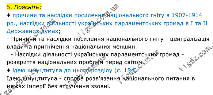 Поясніть: ♦ причини та наслідки посилення національного гніту в 1907-1914 рр., наслідки діяльності українських парламентських громад в І та ІІ Державних думах; - Причини та наслідки посилення національного гніту - централізація влади та пригнічення національних меншин. - Наслідки діяльності українських парламентських громад - розкриття національних проблем перед світом. ♦ ідею шмуцтитула до цього розділу (с. 184). Ідею шмуцтитула - спроба розв'язання національного питання в межах імперії без втручання ззовні.