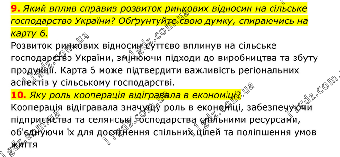 9. Який вплив справив розвиток ринкових відносин на сільське господарство України? Обґрунтуйте свою думку, спираючись на карту 6. Розвиток ринкових відносин суттєво вплинув на сільське господарство України, змінюючи підходи до виробництва та збуту продукції. Карта 6 може підтвердити важливість регіональних аспектів у сільському господарстві. 10. Яку роль кооперація відігравала в економіці? Кооперація відігравала значущу роль в економіці, забезпечуючи підприємства та селянські господарства спільними ресурсами, об'єднуючи їх для досягнення спільних цілей та поліпшення умов життя