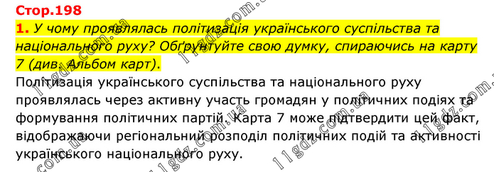 У чому проявлялась політизація українського суспільства та національного руху? Обґрунтуйте свою думку, спираючись на карту 7 (див. Альбом карт). Політизація українського суспільства та національного руху проявлялась через активну участь громадян у політичних подіях та формування політичних партій. Карта 7 може підтвердити цей факт, відображаючи регіональний розподіл політичних подій та активності українського національного руху.