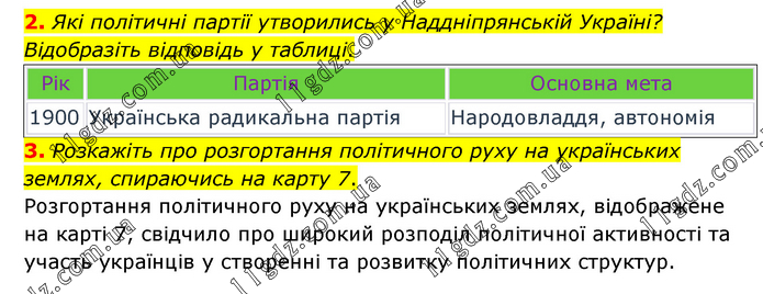 2. Які політичні партії утворились у Наддніпрянській Україні? Відобразіть відповідь у таблиці. Рік Партія Основна мета 1900 Українська радикальна партія Народовладдя, автономія 3. Розкажіть про розгортання політичного руху на українських землях, спираючись на карту 7. Розгортання політичного руху на українських землях, відображене на карті 7, свідчило про широкий розподіл політичної активності та участь українців у створенні та розвитку політичних структур.
