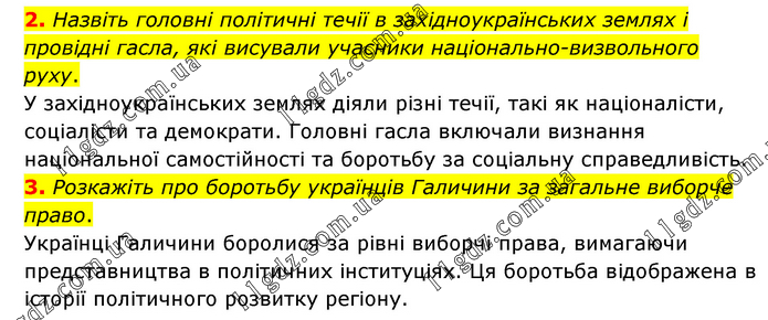 2. Назвіть головні політичні течії в західноукраїнських землях і провідні гасла, які висували учасники національно-визвольного руху. У західноукраїнських землях діяли різні течії, такі як націоналісти, соціалісти та демократи. Головні гасла включали визнання національної самостійності та боротьбу за соціальну справедливість. 3. Розкажіть про боротьбу українців Галичини за загальне виборче право. Українці Галичини боролися за рівні виборчі права, вимагаючи представництва в політичних інституціях. Ця боротьба відображена в історії політичного розвитку регіону.