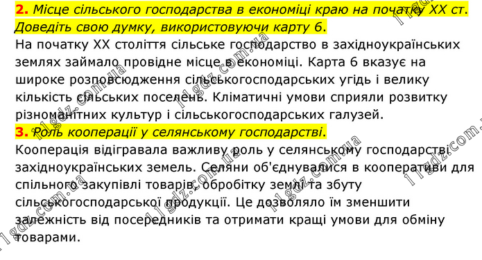 2. Місце сільського господарства в економіці краю на початку ХХ ст. Доведіть свою думку, використовуючи карту 6. На початку ХХ століття сільське господарство в західноукраїнських землях займало провідне місце в економіці. Картa 6 вказує на широке розповсюдження сільськогосподарських угідь і велику кількість сільських поселень. Кліматичні умови сприяли розвитку різноманітних культур і сільськогосподарських галузей. 3. Роль кооперації у селянському господарстві. Кооперація відігравала важливу роль у селянському господарстві західноукраїнських земель. Селяни об'єднувалися в кооперативи для спільного закупівлі товарів, обробітку землі та збуту сільськогосподарської продукції. Це дозволяло їм зменшити залежність від посередників та отримати кращі умови для обміну товарами.