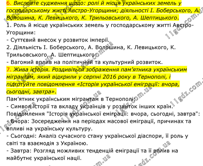 6. Висловте судження щодо: ролі й місця українських земель у господарському житті Австро-Угорщини; діяльності І. Боберського, А. Волошина, К. Левицького, К. Трильовського, А. Шептицького. 1. Роль й місце українських земель у господарському житті Австро-Угорщини: - Суттєвий внесок у розвиток імперії. 2. Діяльність І. Боберського, А. Волошина, К. Левицького, К. Трильовського, А. Шептицького: - Вагомий вплив на політичний та культурний розвиток. 7. Жива історія. Роздивіться зображення пам’ятника українським мігрантам, який відкрили у серпні 2016 року в Тернополі, і підготуйте повідомлення «Історія української еміграції: вчора, сьогодні, завтра». Пам’ятник українським мігрантам в Тернополі: - Символ історії та вкладу українців у розвиток інших країн. Повідомлення "Історія української еміграції: вчора, сьогодні, завтра": - Вчора: Зосередження на періодах масової еміграції, причинах та впливі на українську культуру. - Сьогодні: Аналіз сучасного стану української діаспори, її роль у світі та взаємодія з Україною. - Завтра: Розгляд можливих тенденцій еміграції та її вплив на майбутнє української нації.