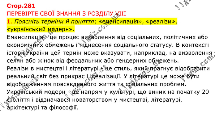 ПЕРЕВІРТЕ СВОЇ ЗНАННЯ З РОЗДІЛУ VІІІ 1. Поясніть терміни й поняття; «емансипація», «реалізм», «український модерн». Емансипація - це процес визволення від соціальних, політичних або економічних обмежень і піднесення соціального статусу. В контексті історії України цей термін може вказувати, наприклад, на визволення селян або жінок від феодальних або гендерних обмежень. Реалізм в мистецтві і літературі - це стиль, який прагнує відобразити реальний світ без прикрас і ідеалізації. У літературі це може бути відображенням повсякденного життя та соціальних проблем. Український модерн - це напрям у культурі, що виник на початку 20 століття і відзначався новаторством у мистецтві, літературі, архітектурі та філософії.