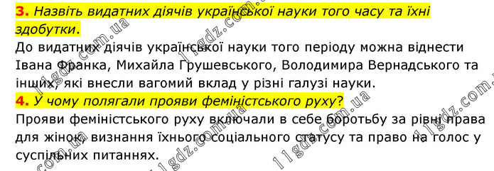 3. Назвіть видатних діячів української науки того часу та їхні здобутки. До видатних діячів української науки того періоду можна віднести Івана Франка, Михайла Грушевського, Володимира Вернадського та інших, які внесли вагомий вклад у різні галузі науки. 4. У чому полягали прояви феміністського руху? Прояви феміністського руху включали в себе боротьбу за рівні права для жінок, визнання їхнього соціального статусу та право на голос у суспільних питаннях.